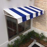 ◼︎施工前 ◼︎施工後 ◼︎ご要望 施設の大型窓の上部3箇所にヒサシを取付けて欲しいとご要望でした。 フレームは出来るだけシンプルに、生地の柄を約300mm幅の青・白のストライブで割り切れるように、などの内容でし …